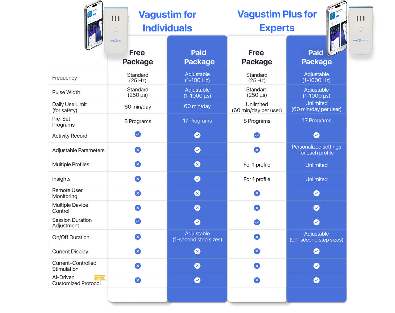 - Vagustim v2 Plus: Obegränsad stimulering per dag (60 min per användare), obegränsat antal användare.